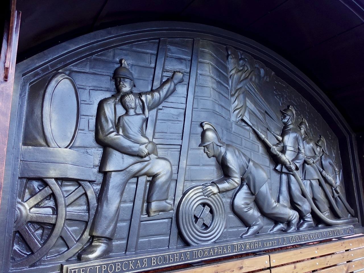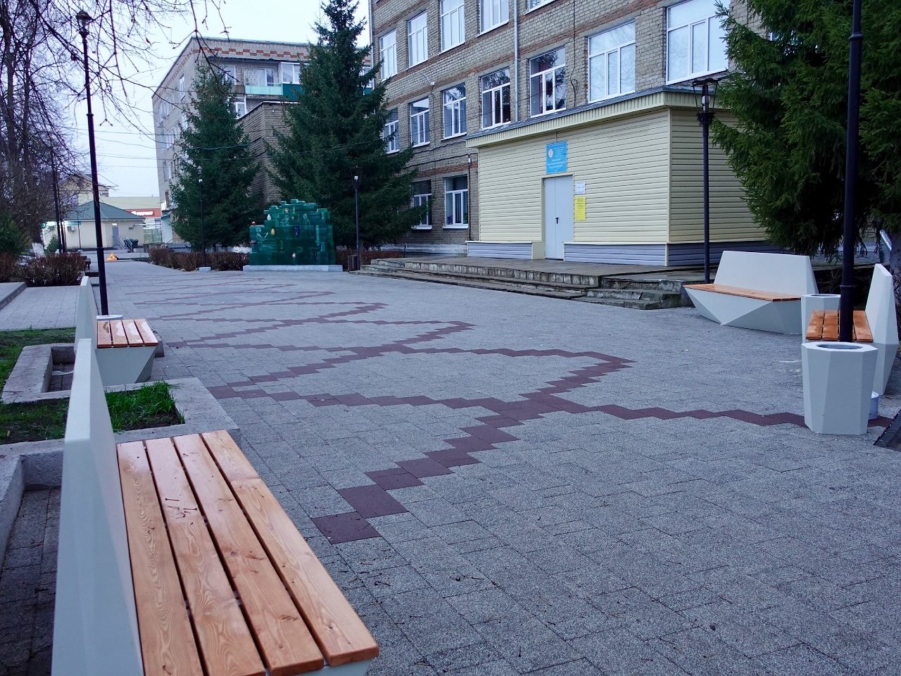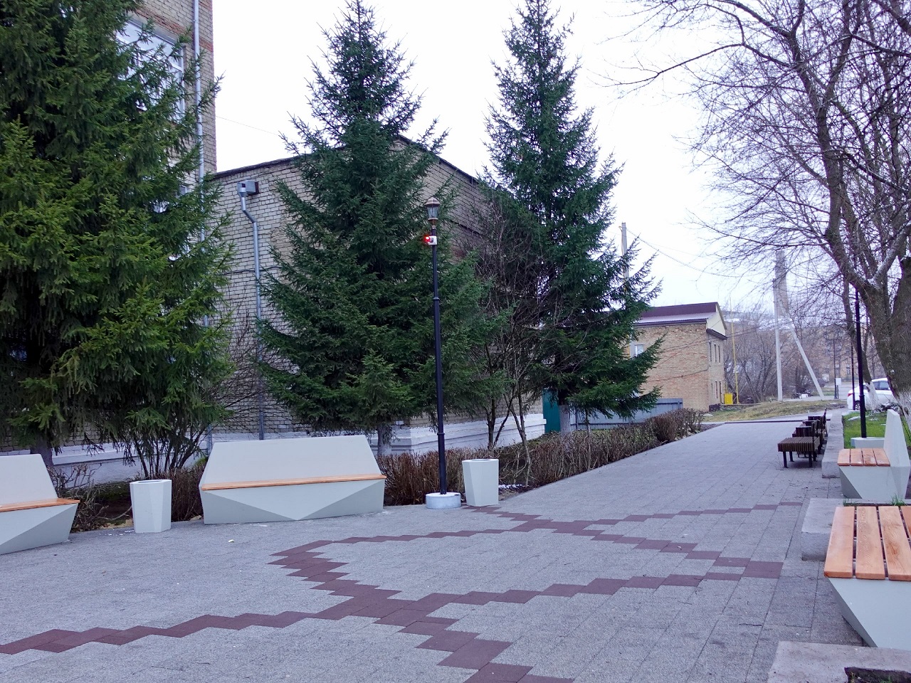 На прошлой неделе здесь завершились работы: установили барельеф, посвященный первым огнеборцам – он стал дополнением к ранее установленному арт-объекту. Возле здания Никольского технологического колледжа появились новые лавочки.