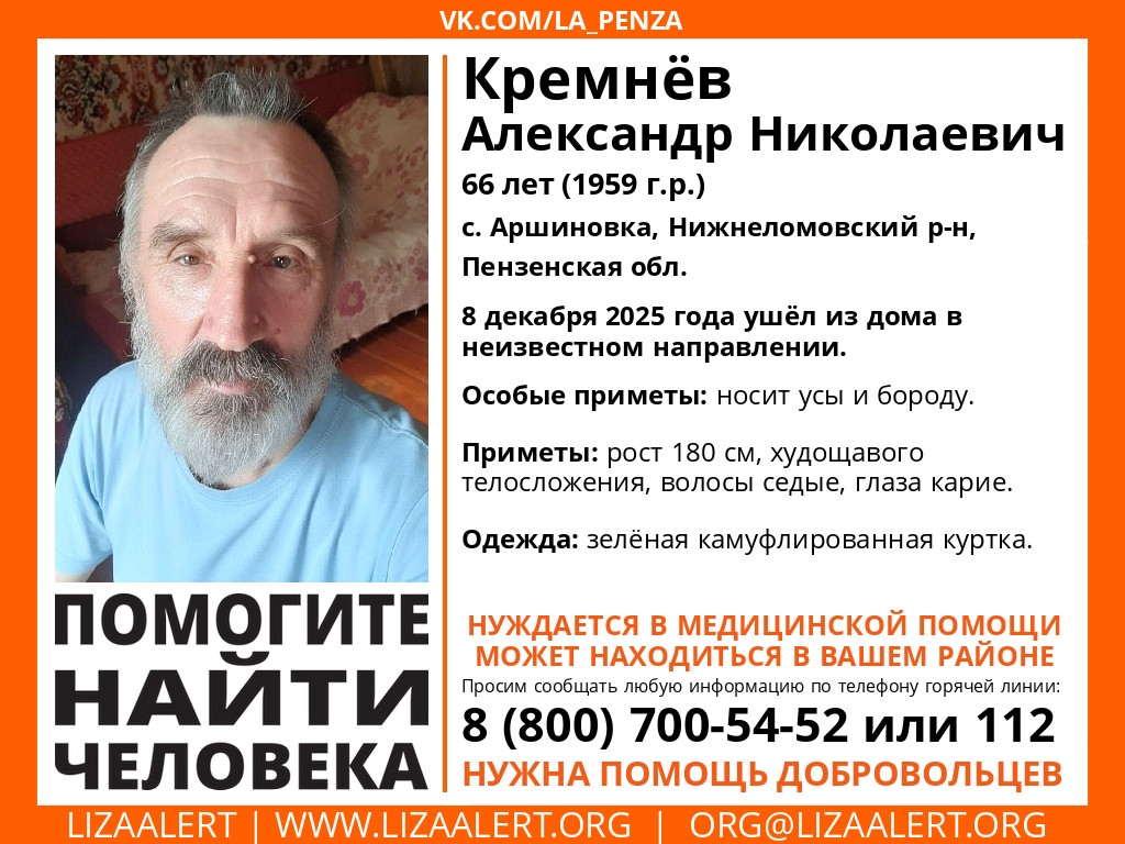 Волонтеры пензенского поисково-спасательного отряда «Лиза Алерт» сообщили о розыске жителя Нижнеломовского района. Речь идет о 66-летнем Кремневе Александре Николаевиче, проживающем в селе Аршиновка.