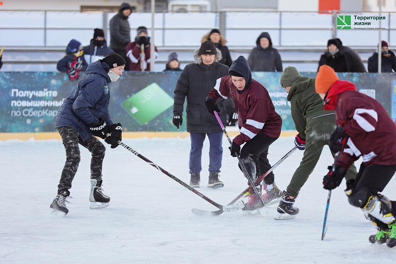 Ухаживает за площадкой местный застройщик. В выходные были организованы хоккейные матчи среди школьных и дворовых команд.