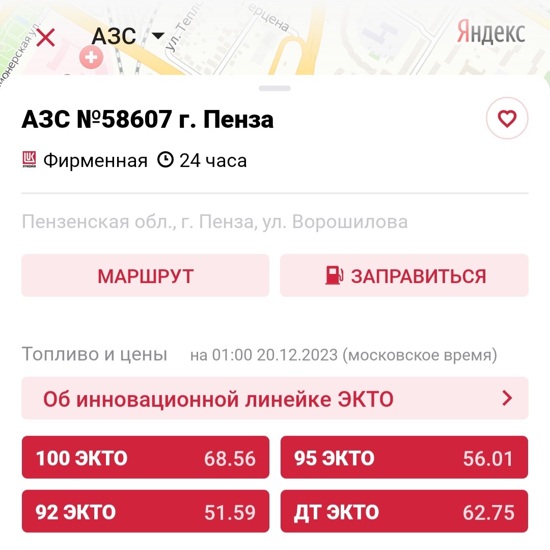 Сегодня, 20 декабря, можно заметить, как на той же заправочной станции изменились цены. Теперь литр 92-го стоит 51,59 рубля, литр 95-го – 56,01 рубля. Также подорожал АИ-100 – до 68,56 рубля. Дизельное топливо теперь стоит 62,75 рубля.