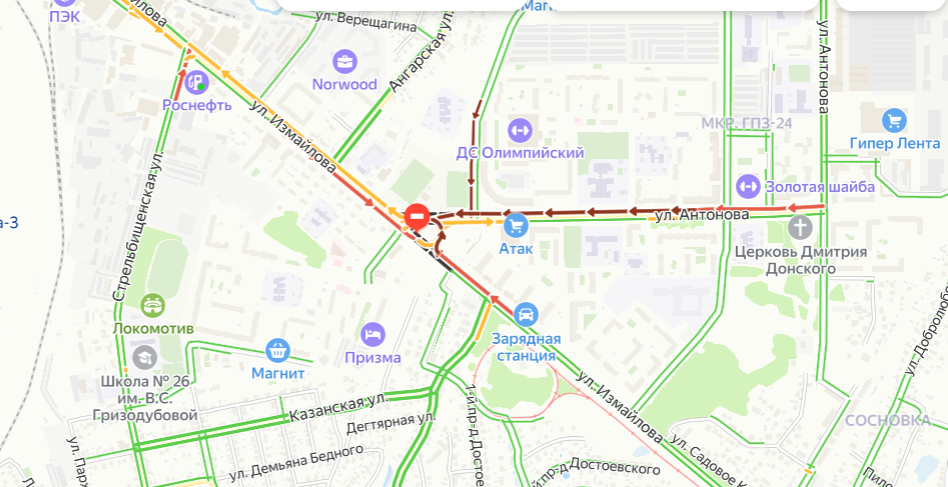 Поскольку Измайлова в приоритете, выехать в центр с улицы Антонова было города гораздо сложнее. Весь поток упирается в узкое бутылочное горлышко из одной полосы, огороженной бетонными блоками. Образовалась традиционная для этого микрорайона пробка. Однако водители отмечают,  что поток всё же двигался.