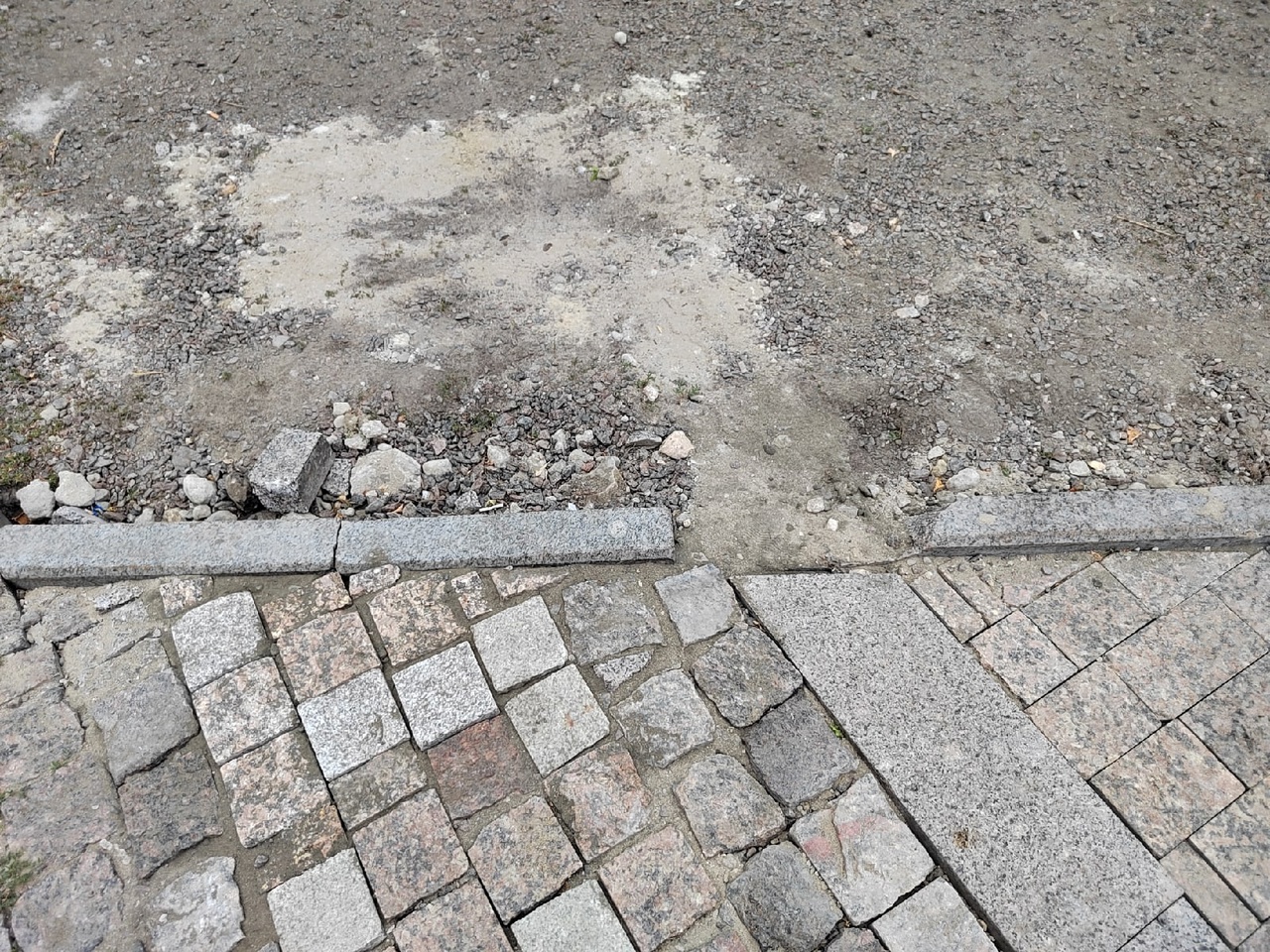Действительно, кладку поправили, теперь все выглядит более или менее прилично. Однако бордюра не хватило. По всей вероятности, его установят, когда найдут замену пропавшему элементу.