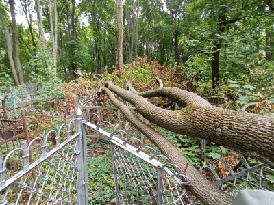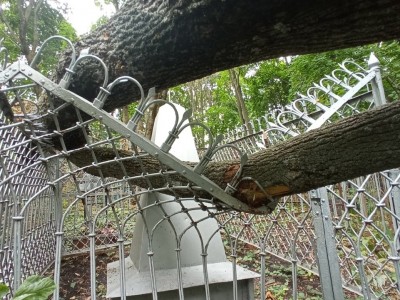 В качестве доказательств он опубликовал фото, на которых видно огромное дерево, лежащее прямо на ограде могилы. От его тяжести ограда оказалась серьезно смята. При этом дерево настолько огромное, что просто сдвинуть его не выйдет, скорее всего ствол придется распиливать.