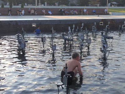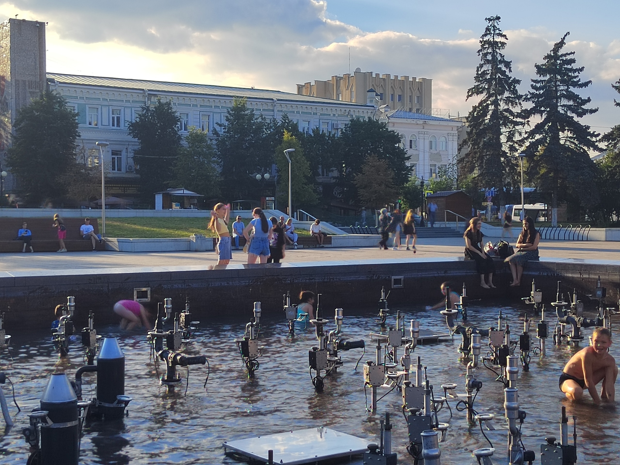 Судя по снимкам, днем светомузыкальный фонтан не работал, однако в нем осталось немного воды. В нее решили погрузиться не менее 5 ребятишек раздетых по трусы. Подростки и взрослые ограничились тем, что просто сели по бортам конструкции и свесили в воду ноги.