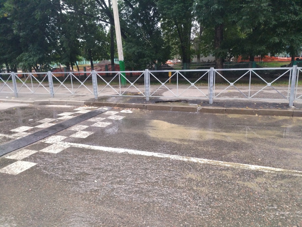 Свои слова он подкрепил фотографией, на которой видно проезжую часть залитую водой. На пешеходной дорожке появился обвал асфальта, в яме образовалась лужа.