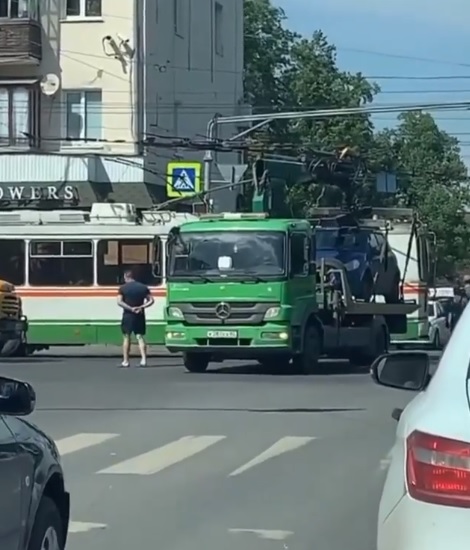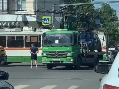 На записи видно грузовой спецавтомобиль, остановившийся посреди проезжей части. Видно, что автомобиль, занимающийся перевозкой других машин задел троллейбусные провода.