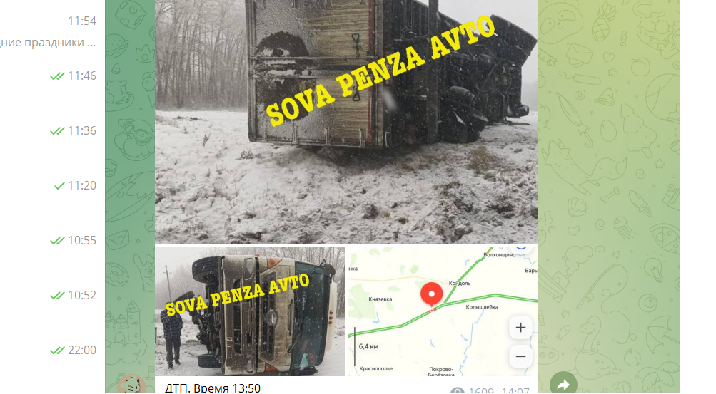 Сегодня, 12 декабря, в Пензенской области в районе села Кондоль произошло серьезное ДТП с участием фуры. Многотонный грузовик не справился с управлением на заснеженной дороге и съехал в кювет.