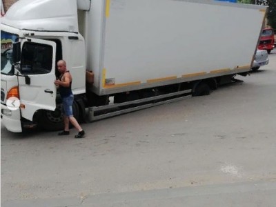 Фото с места происшествия были опубликованы в соцсети. На снимках видно, что большегруз провалился в яму задним колесом, автомобиль сильно накренило.