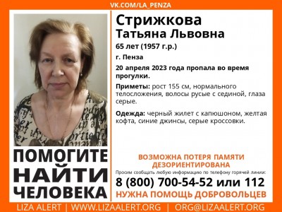 20 апреля 65-летняя Стрижкова Татьяна Львовна заблудилась во время прогулки в Пензе. Женщина потеряла память, поэтому дезориентирована.