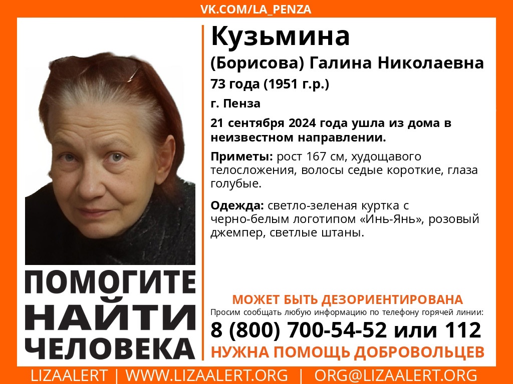 Волонтеры «Лиза Алерт» просят помощи в поисках 73-летней Галины Николаевны Кузьминой (Борисовой), которая пропала в Пензе в субботу, 21 сентября.