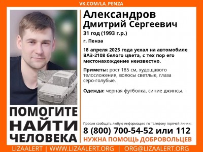Известно, что пензенец 18 апреля уехал на автомобиле «ВАЗ 2108» белого цвета. С тех пор он не выходил на связь с родными.