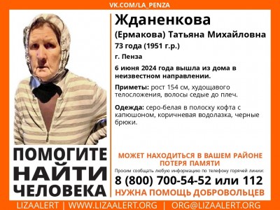 В Пензе пропала 73-летняя Жданенкова (Ермакова) Татьяна Михайловна. 6 июня она вышла из дома в неизвестно направлении, и больше старушку никто не видел.