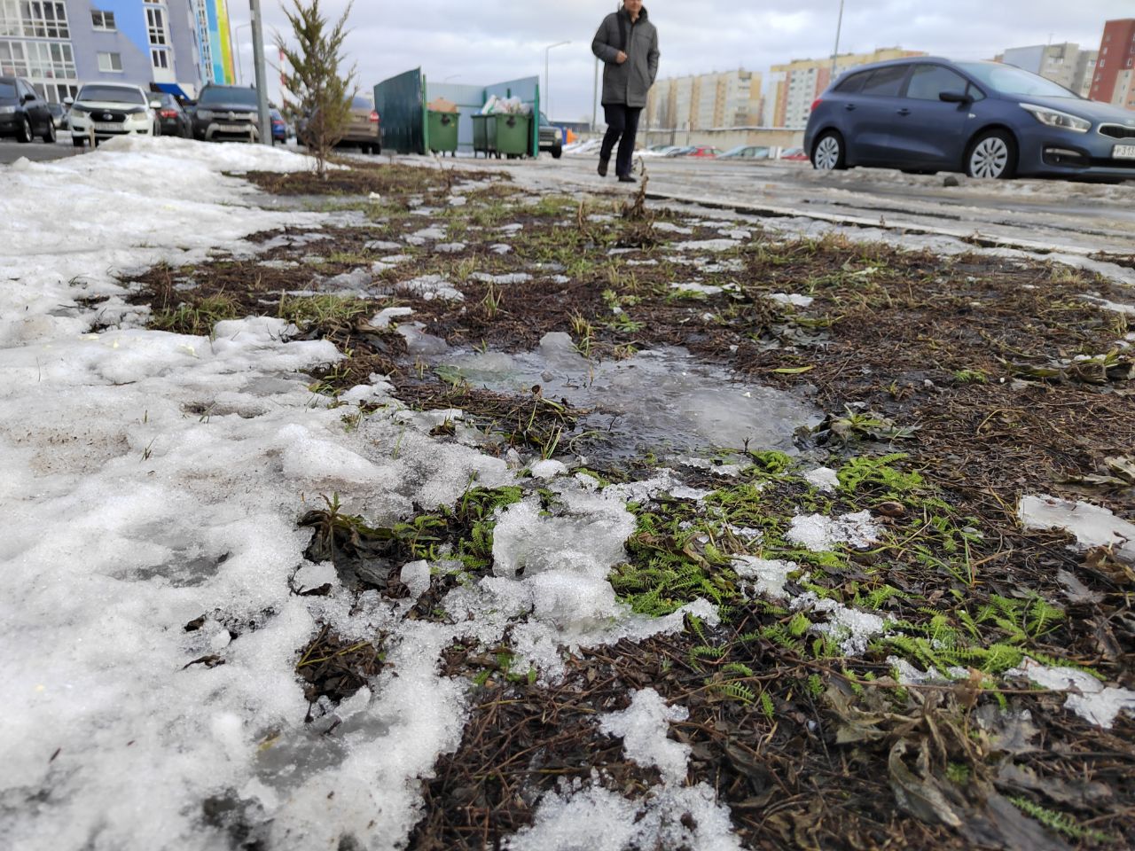 Плюсовая температура спровоцировала и раннее пробуждение природы: сквозь проталины пробиваются свежие зеленые побеги травы.