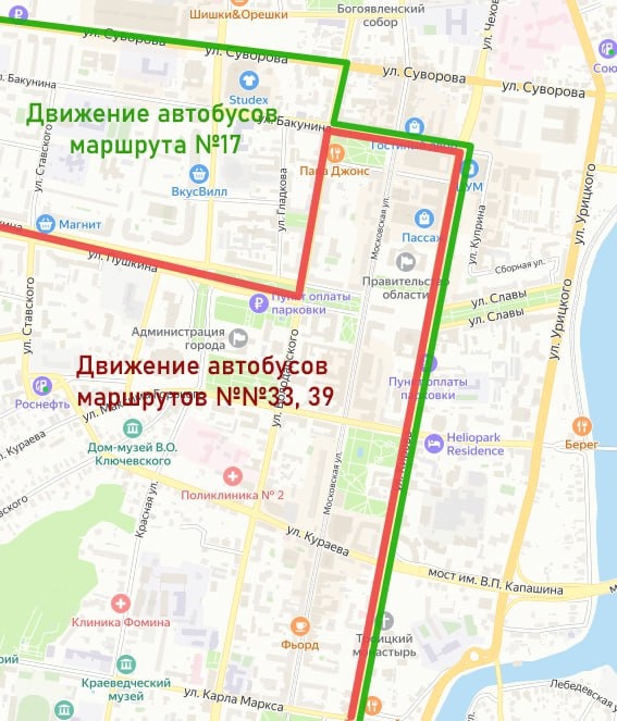 Движение автобусов малого класса маршрута № 17 по ул. Кирова также прекратится. Они поедут по улицам Бакунина, Володарского, Суворова и далее по маршруту в обоих направлениях.