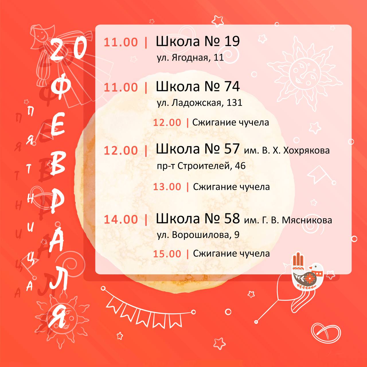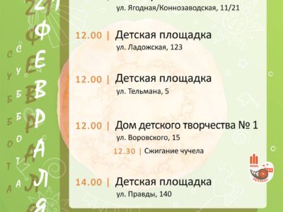 Праздничные события начнутся в пятницу, 20 февраля, в городских школах. В 11:00 гуляния стартуют в школах № 19 и № 74, в полдень к ним присоединится школа № 57, а в 14:00 праздник начнется в школе № 58. В субботу, 21 февраля, эстафету подхватят другие районы. В 11:00 торжество откроется в подразделении «Заря», в 12:00 гуляния пройдут в доме детского творчества № 1 и на детских площадках по улицам Ладожской и Тельмана, а в 14:00 — на улице Правды.