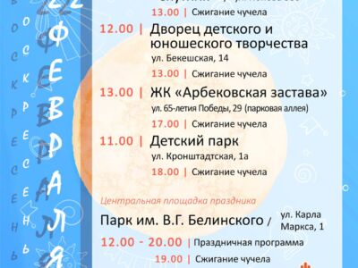 Самые масштабные гуляния запланированы на воскресенье, 22 февраля. Утром в 10:30 откроется площадка у школы № 47. С 11:00 праздники начнутся в парке «Комсомольский», структурном подразделении «Маяковский», зоопарке, а также в нескольких центрах детского творчества и развития. В полдень к ним добавятся школы искусств и молодежные центры. В час дня развлекательная программа стартует в жилом комплексе «Арбековская застава» и начнется вторая часть праздника в зоопарке, рассчитанная на взрослую аудиторию.
