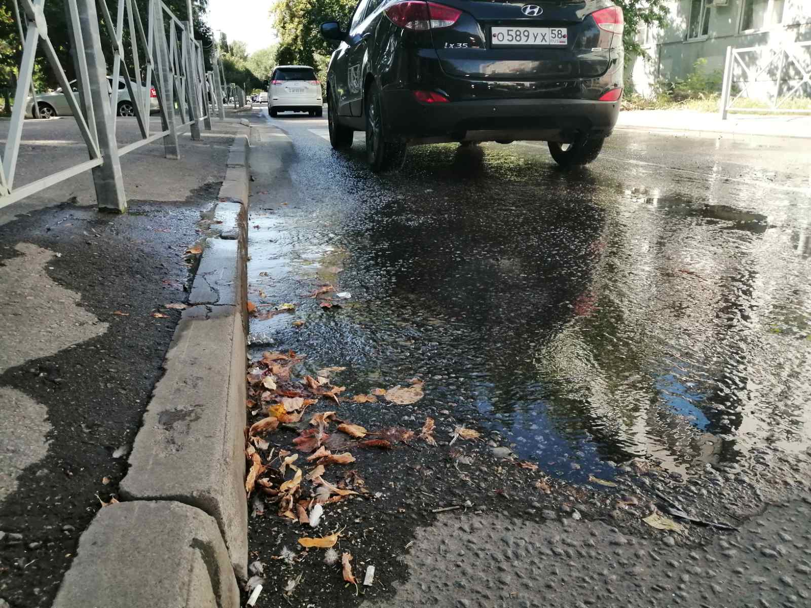 Фотографии с места происшествия в редакцию «Столицы 58» прислал один из очевидцев. На снимках видно как пузырится вода от сильного напора. Также заметно, что мокрой стала не только вся проезжая часть, но и пешеходная дорожка.