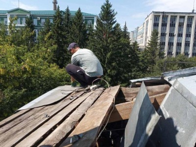В настоящее время кровельщики занимаются демонтажем старой крыши. К месту работ уже подвезли необходимые строительные материалы.