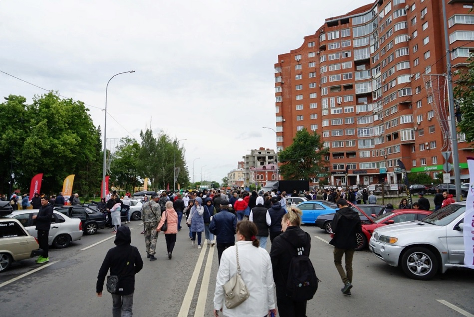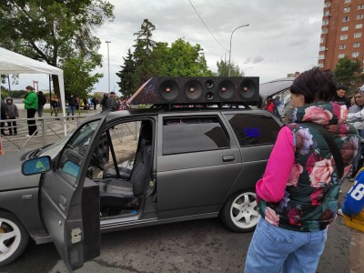Владельцы авто демонстрируют звук. Присутствующие шутят, что от громкого саунда машины даже подпрыгивают.