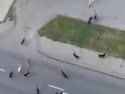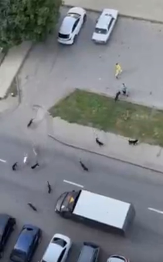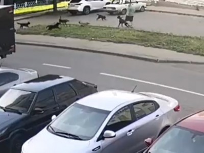 После этого в соцсети было опубликовано сразу два видео, на которых можно увидеть, как та же стая напала на мужчину, гуляющего со своим домашним псом. К нему на подмогу подбежала женщина, вдвоем они смогли разогнать лающих собак.