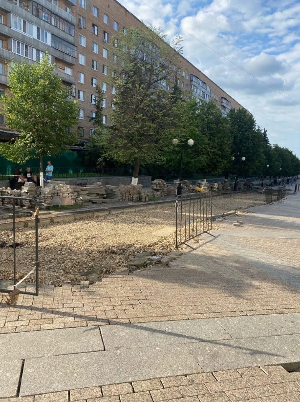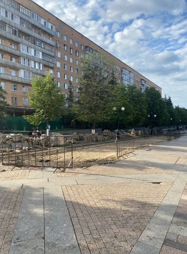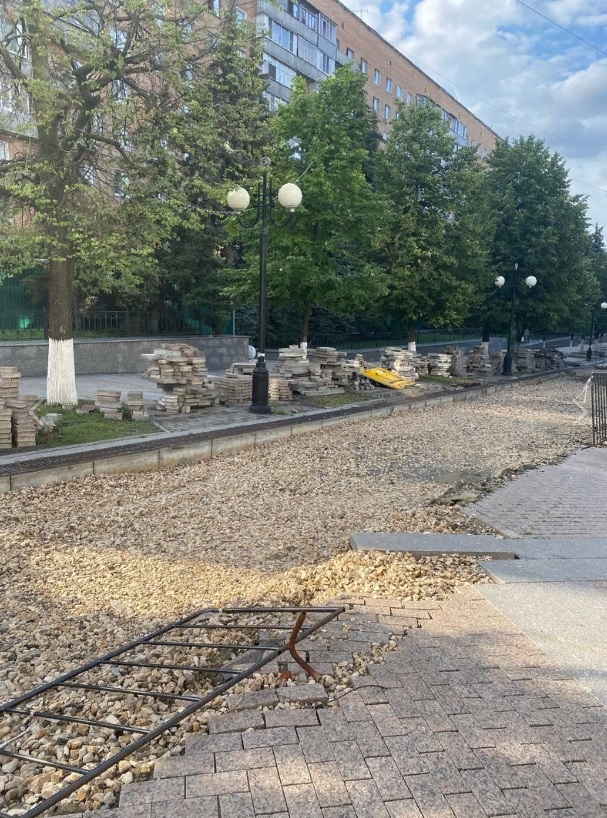 Работы по починке труб завершили, огромную яму закопали. А вот мощение плиткой пока не восстановили.