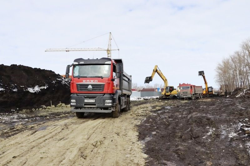 Одновременно на строительной площадке работает множество техники: бульдозер, автогрейдер, дорожный каток, а также по 4 экскаватора и самосвала.
