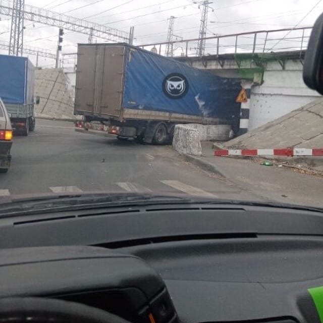 Фото с места происшествия было опубликовано одним из очевидцев в социальной сети «Вконтакте». На снимке видно образовавшийся на дороге затор и виновника пробки – грузовик с прицепом, водитель которого попытался проскочить под мостом, но увы не вышло.