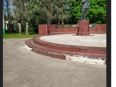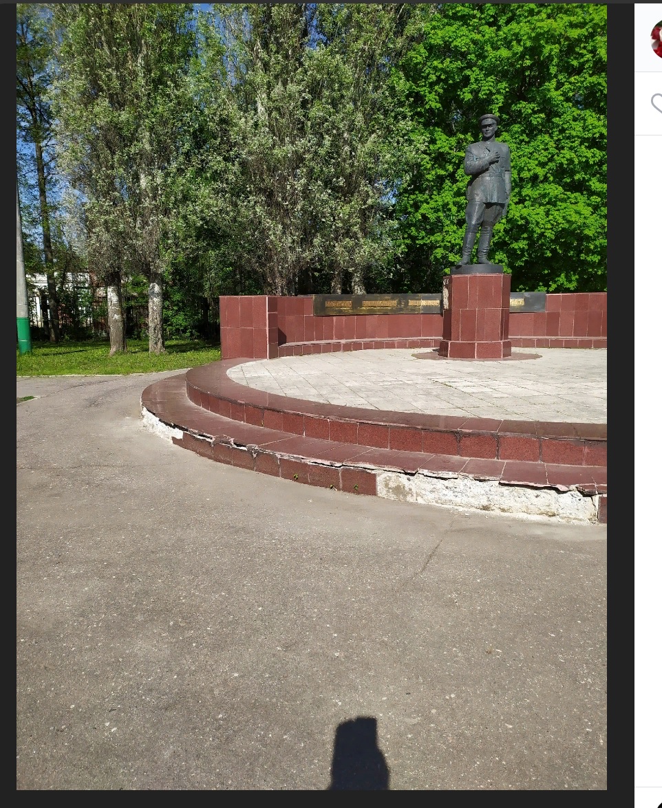 На снимках можно увидеть, что облицовка монумента во многих местах обвалилась. Плитки отсутствуют, как на самом памятнике, так и на его постаменте.