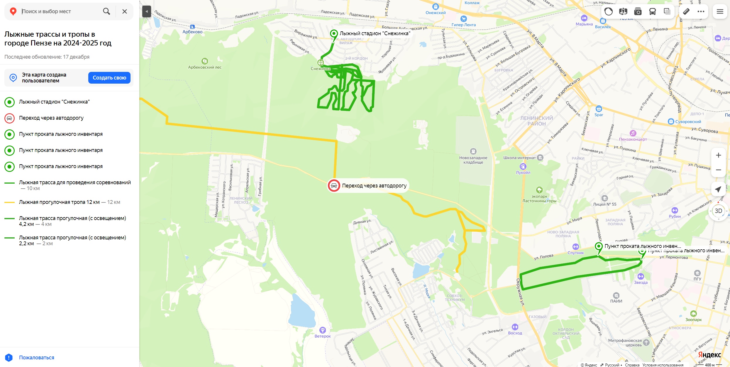 Городской комитет по физической культуре, спорту и молодежной политике подготовил лыжные трассы для тренировок и активного отдыха жителей Пензы. Для удобства поиска ближайшей лыжни создана интерактивная карта, ссылку на нее разместили на сайте администрации города.