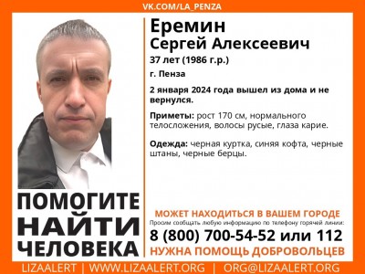 В Пензе разыскивают 37-летнего Еремина Сергея Алексеевича, который вышел из дома 2 января и пропал.