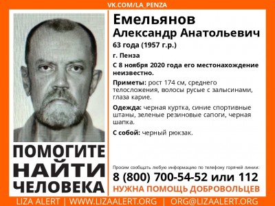8 ноября в Пензе пропал 63-летний Емельянов Александр Анатольевич. Уже больше недели никто не может выйти с ним на связь.