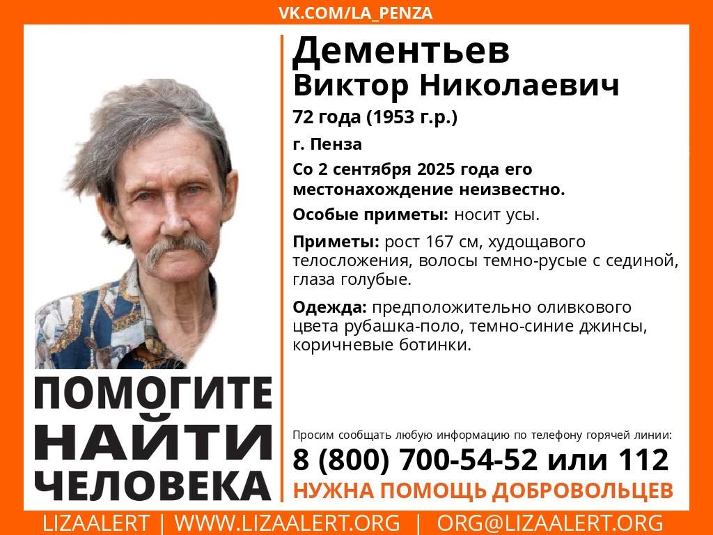 В Пензе разыскивается Дементьев Виктор Николаевич, 72 года (1953 г.р.). С 2 сентября 2025 года его местонахождение неизвестно.