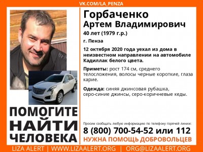 Пропал 40-летний пензенец Артем Владимирович Горбаченко. Известно, что 12 октября он уехал на своем белом Кадиллаке в неизвестном направлении. С тех пор о местонахождении мужчины ничего не известно.