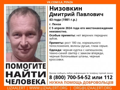 В Пензе разыскивают 43-летнего Низовкина Дмитрия Павловича, который 5 апреля ушел из дома и не вернулся. Ориентировка появилась в группе поискового отряда «Лиза Алерт».