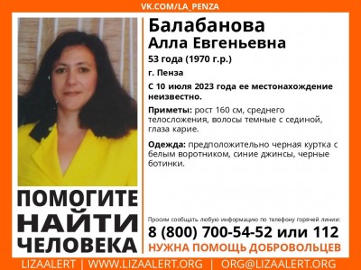 В Пензе разыскивают 53-летнюю Аллу Евгеньевну Балабанову, которая 10 июля вышла из дома и пропала.