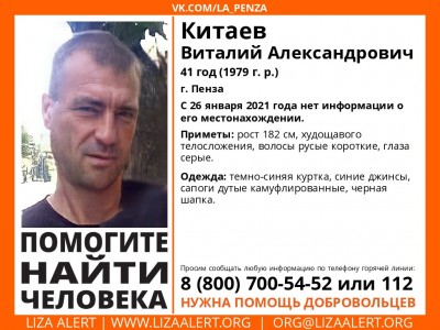 В пятницу, 29 января, в группе волонтеров из поискового отряда «Лиза Алерт» появилась новая ориентировка на розыск. Пропал 41-летний Китаев Виталий Александрович, проживающий в Пензе.