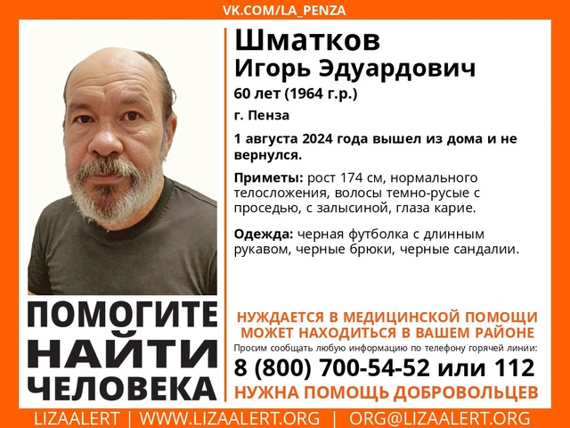 Волонтеры поискового отряда «Лиза Алерт» просят помощи в поисках 60-летнего Игоря Эдуардовича Шматкова, который пропал в Пензе 1 августа.