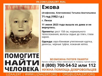 В Пензе разыскивают 71-летнюю Татьяну Ежову (Агафонову, Ключникову). Женщина пропала 11 июня.