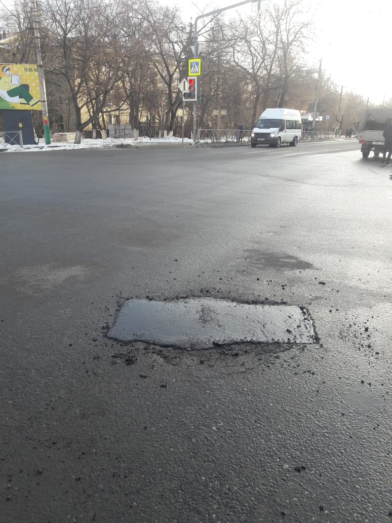 Работы провели в понедельник, 23 января. На перекресте улиц Свердлова и Калинина появилась большая «заплатка» - проезжая часть выровнена.