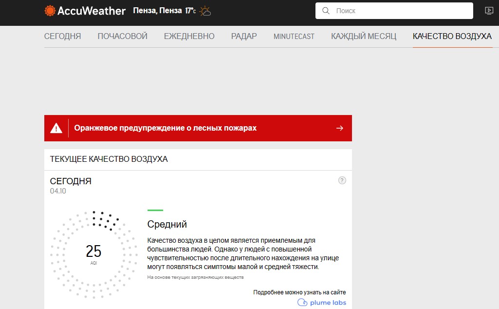 Вместе с тем по данным сервиса, который измеряет состояние воздуха в городе, отклонений нет. В целом по Пензе качество воздуха оценивается как «среднее», приемлемое для большинства людей. Однако у людей с повышенной чувствительностью после длительного нахождения на улице могут появляться симптомы малой и средней тяжести.
