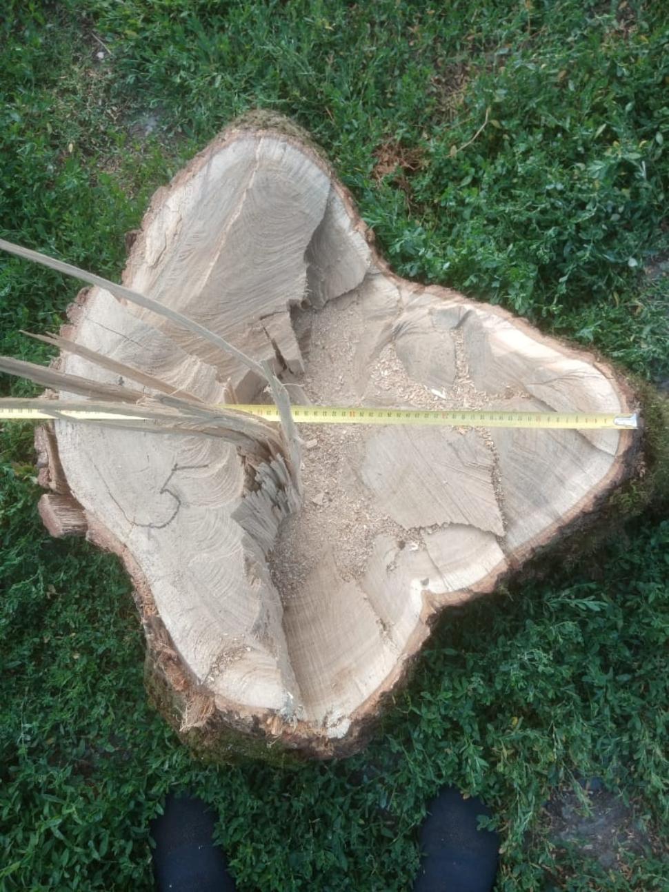 Злоумышленник уничтожил дуб. Он заготовил 8,27 куб. Метров древесины.