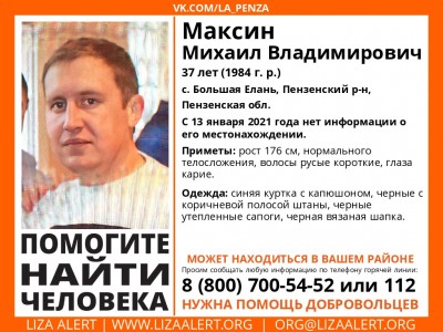 С 13 января 37-летний Михаил Владимирович Максин не выходит на связь. Его местонахождение неизвестно. Пропавший проживал в селе Большая Елань Пензенской области.
