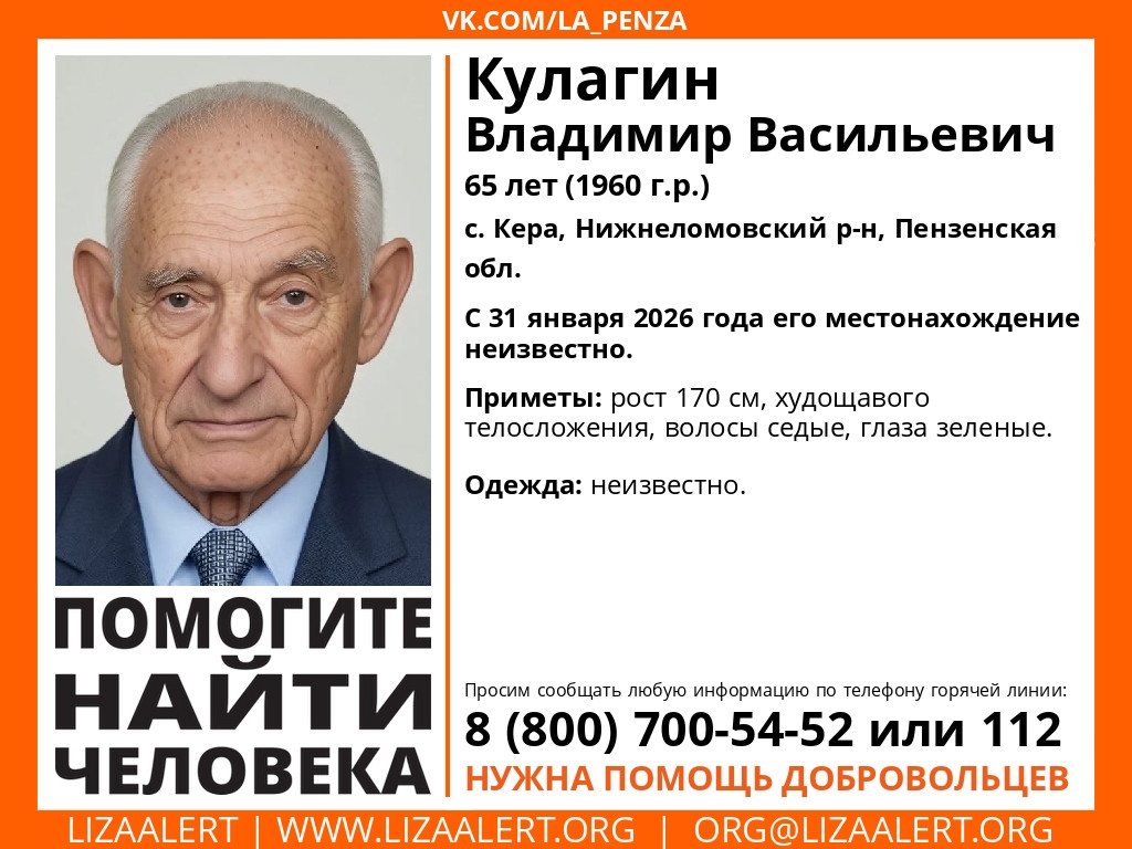 Владимир Васильевич Кулагин проживает в селе Кера Нижнеломовского района. По информации волонтеров, он пропал 31 января 2026 года, с этого дня о его местонахождении ничего не известно.