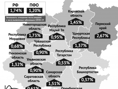 Чаще всего люди умирают от коронавируса в Пермском крае. Там процент смертности заболевших составляет 2,67%. В Нижегородской области – 1,73%, в Самарской области – 1,51%.