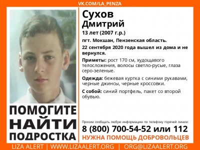 13-летний Дмитрий Сухов вышел из дома 22 сентября. Обратно мальчик не вернулся, ни с кем из родственников на связь не выходил.