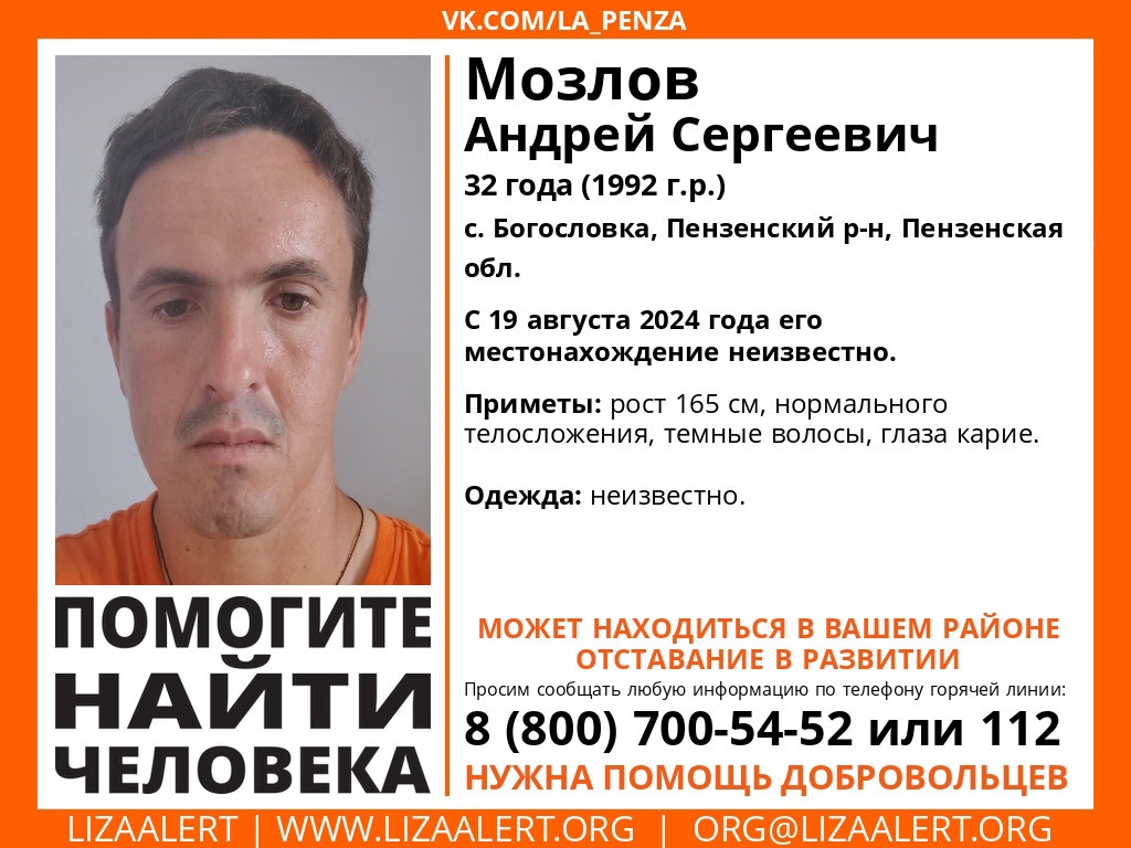 Волонтеры поискового отряда «Лиза Алерт» и полиция просят помощи в поисках 32-летнего жителя села Богословка Пензенского района Андрея Сергеевича Мозлова, который пропал 19 августа 2024 года.