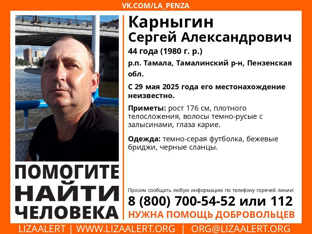В Пензенской области разыскивается Карныгин Сергей Александрович, 44 года (1980 г.р.), проживающий в р.п. Тамала, Тамалинского района. Мужчина пропал 29 мая.