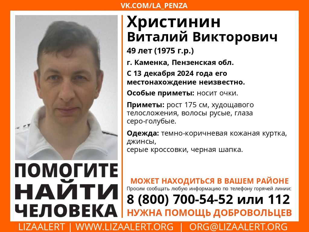 13 декабря 2024 года в городе Каменка, Пензенской области, исчез Виталий Викторович Христинин, 1975 года рождения. Его местонахождение остается неизвестным.