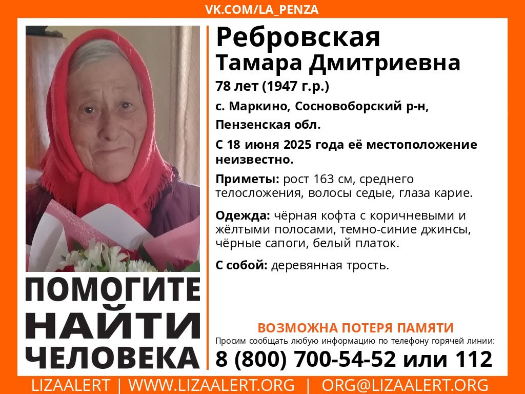Всех, кто располагает какой-либо информацией о местонахождении Тамары Дмитриевны, просят сообщить по телефонам горячей линии пензенского отделения поисково-спасательного отряда Лиза Алерт: 8 (800) 700-54-52 или 112.