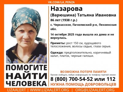 Поисковый отряд «Лиза Алерт» сообщает о розыске пожилой женщины – пропала Назарова (Варюшина) Татьяна Ивановна, 86 лет, проживающая в селе Черкасское Пачелмского района.